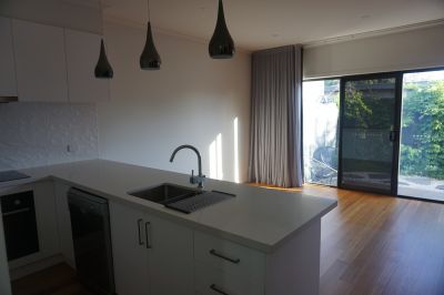 • Open-plan kitchen, dining, and living area with stone benchtops, dishwasher, and access to a private rear courtyard
