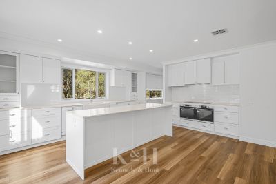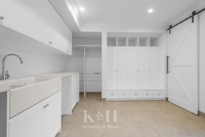 The kitchen is truly a chef's dream with two under-bench ovens, an induction cooktop, two integrated rangehoods, double farmhouse sink, and dishwasher. The full butler's pantry features a second dishwasher, additional farmhouse sink, double fridge cavity, and ample storage.