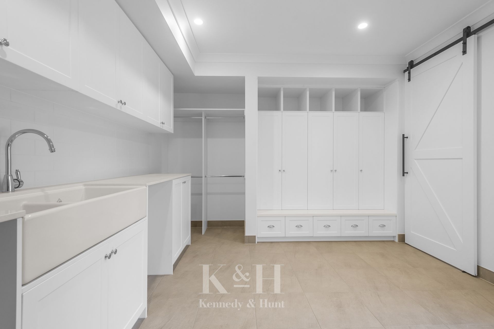 Perfectly combining functionality and style is the superb mudroom/laundry with custom cabinetry including storage cupboards, bench seats, drawers, hanging space, and sink.