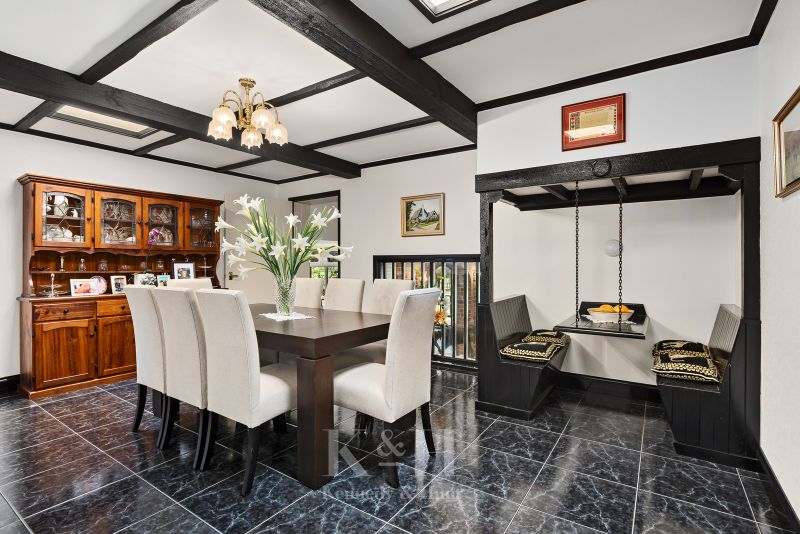 The light-filled formal dining room, complete with a serving hatch and a delightful built-in dining nook, making family meal time effortless.