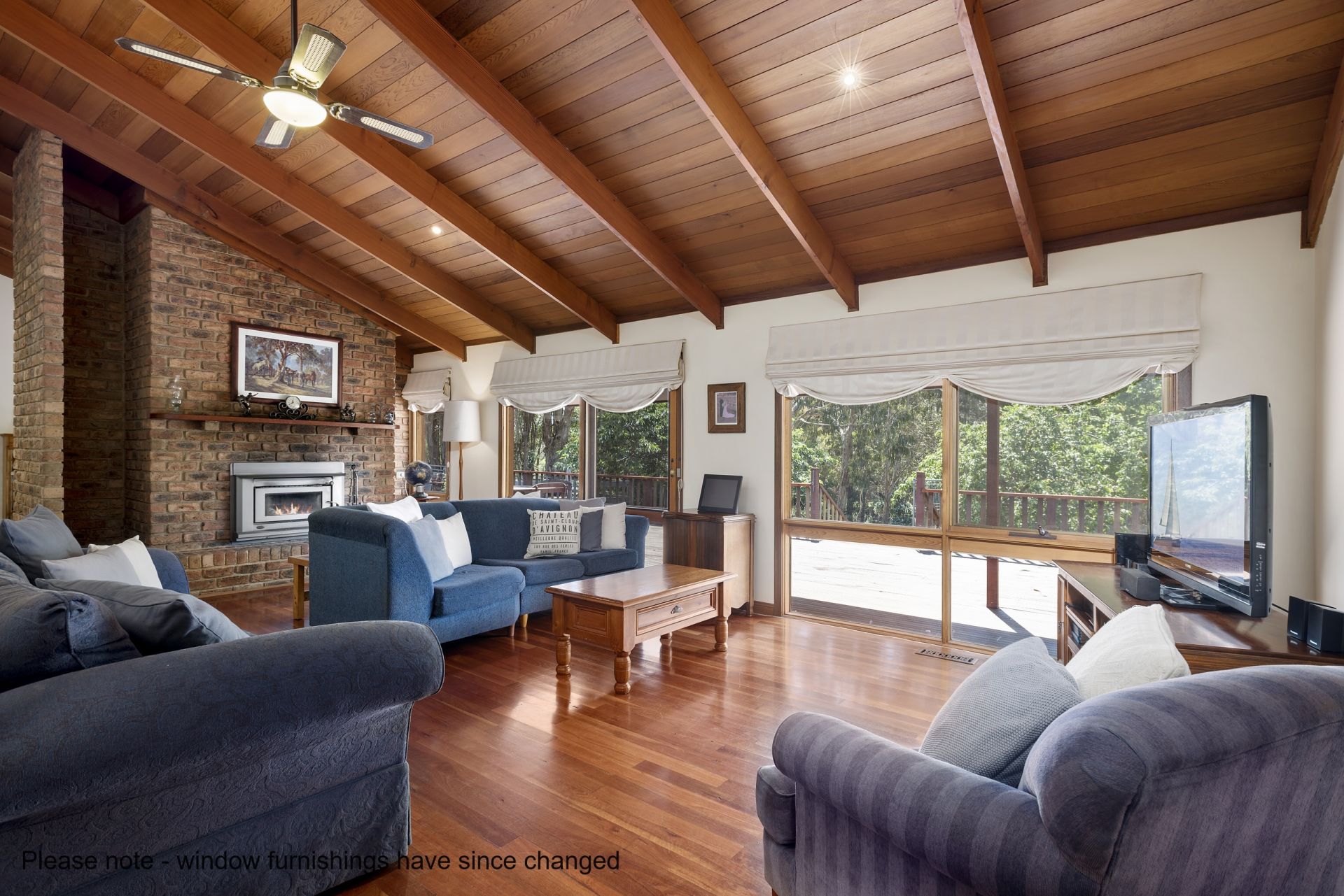 The cosy yet deceivingly large living room, with dramatic vaulted ceilings and slow combustion wood heater, has a superb outlook across the established rear gardens. A separate dining area also enjoys the delightful view.