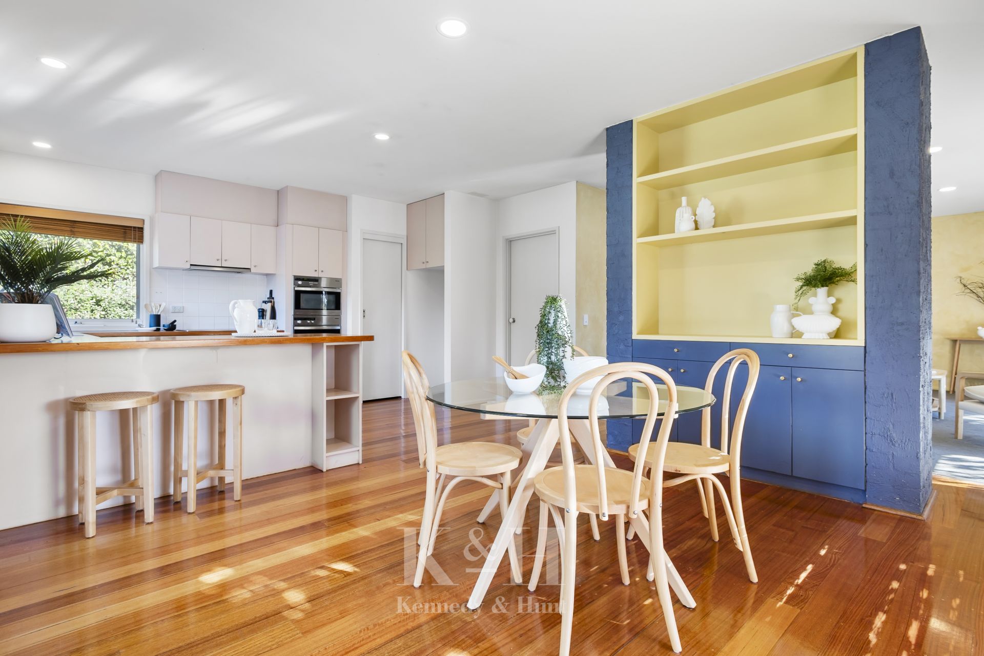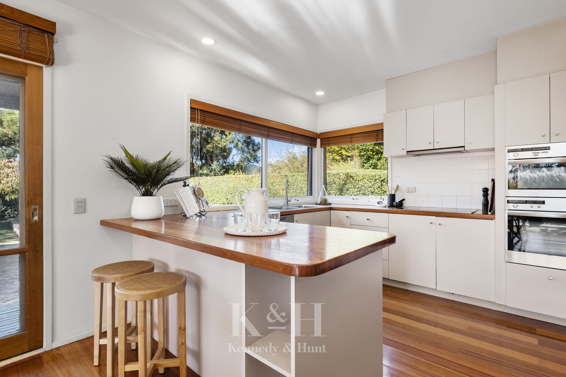 The bright kitchen is a chef's delight with timber benchtops, quality appliances, and ample storage.