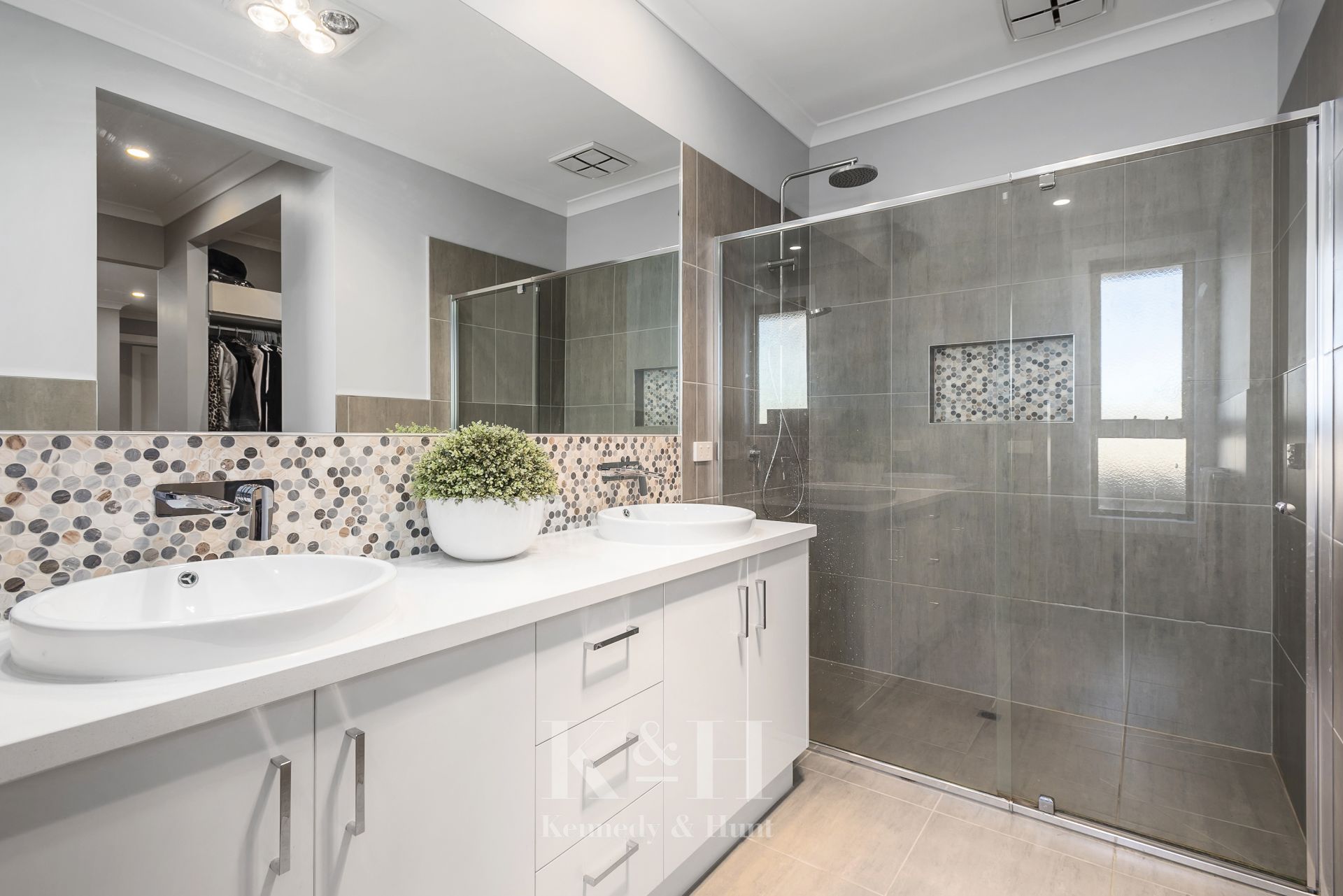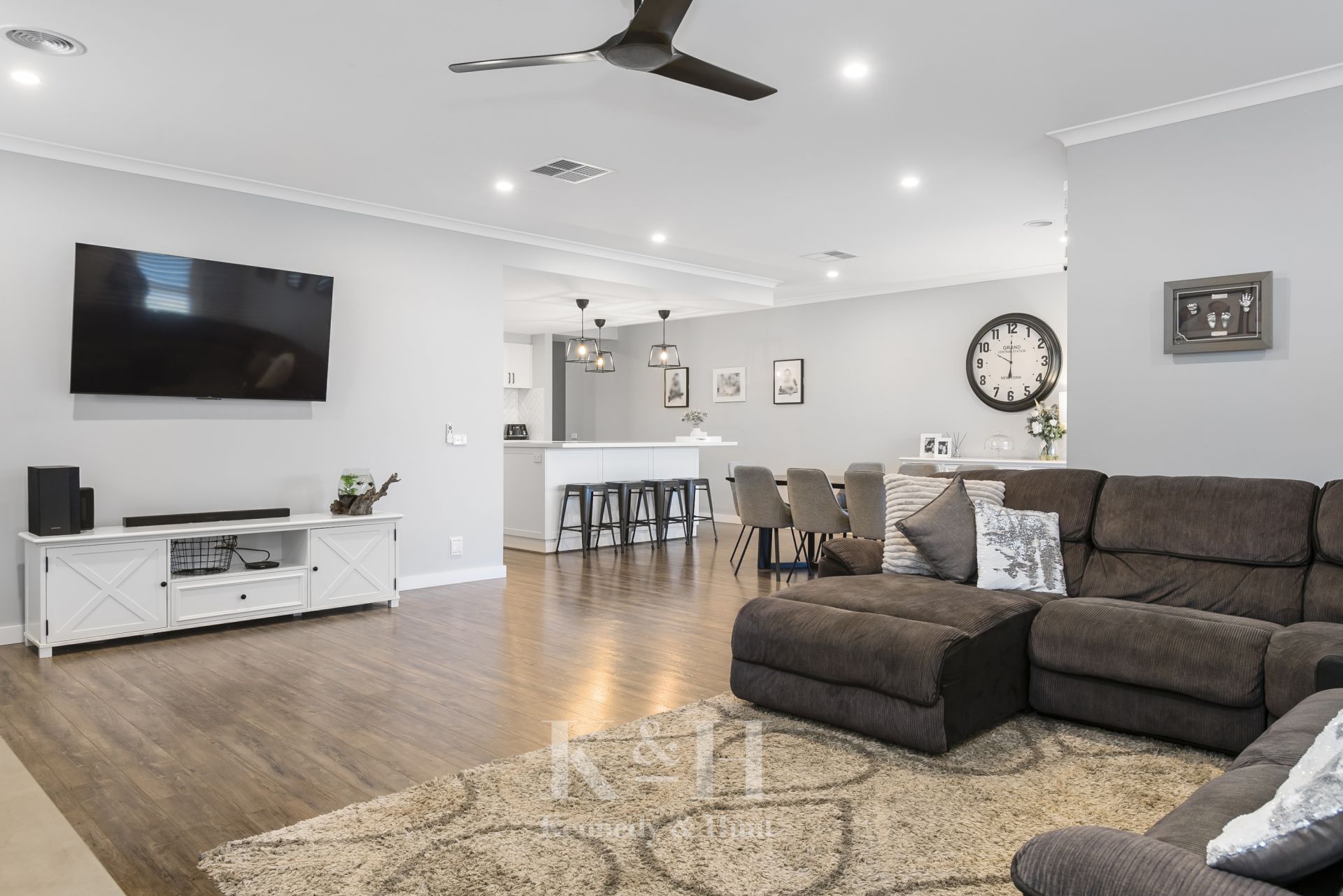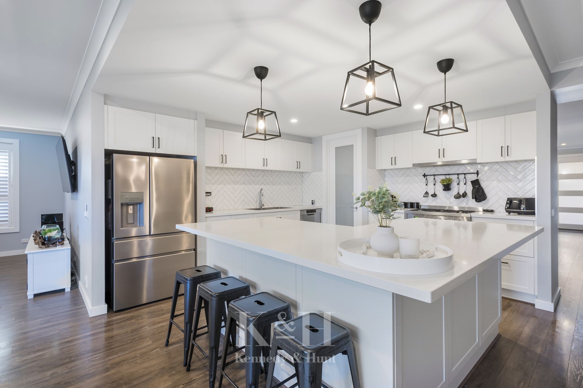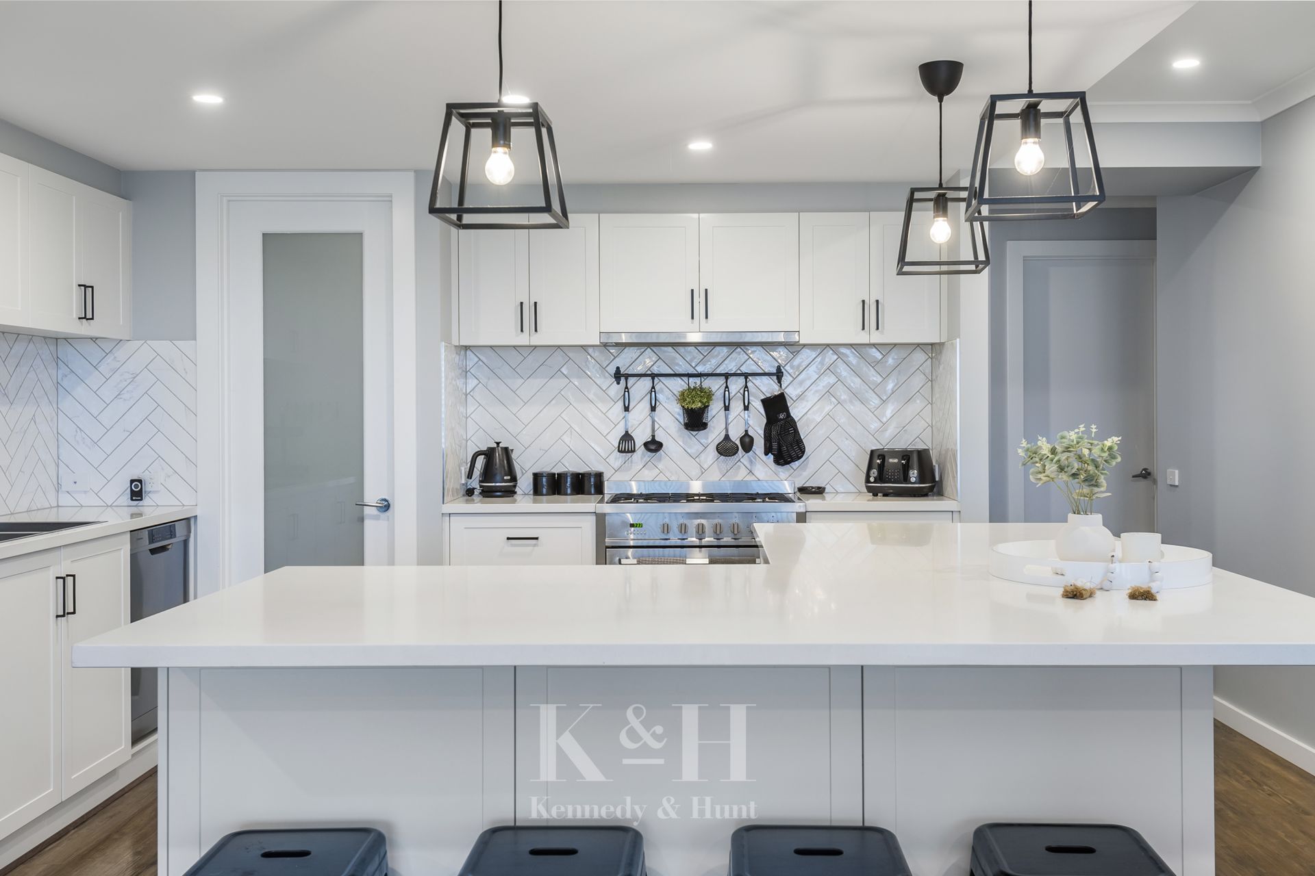 The modern and bright kitchen includes a large island bench, pendant lights, stone bench tops, quality appliances, custom cabinetry, plus an impressive walk-in pantry.