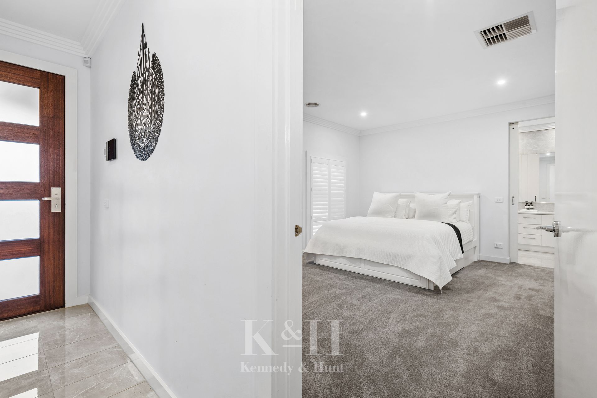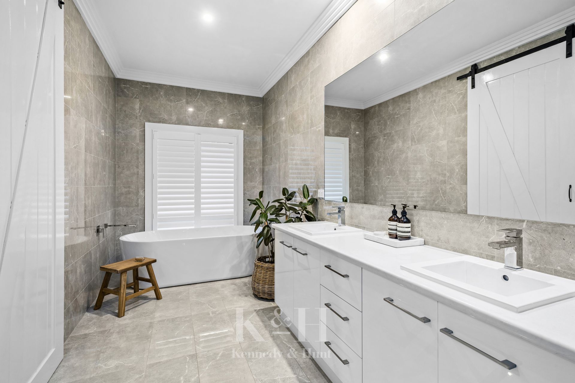 To the front of the home, you will find the stylish and spacious main bedroom suite; featuring an expansive WIR and luxurious ensuite with an extra large shower, floor-to-ceiling tiles, double vanity, and a bath.
