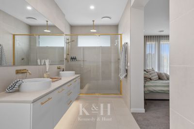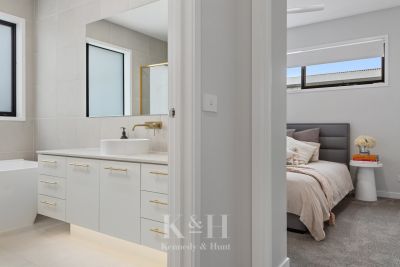The floor plan offers four generously sized bedrooms, with the layout providing privacy and versatility. The sophisticated master suite at the front of the home boasts a luxurious ensuite, dressing room, and calming finishes. The remaining bedrooms, all with built-in robes, are positioned at the rear and serviced by a sleek, deluxe family bathroom and separate powder room.