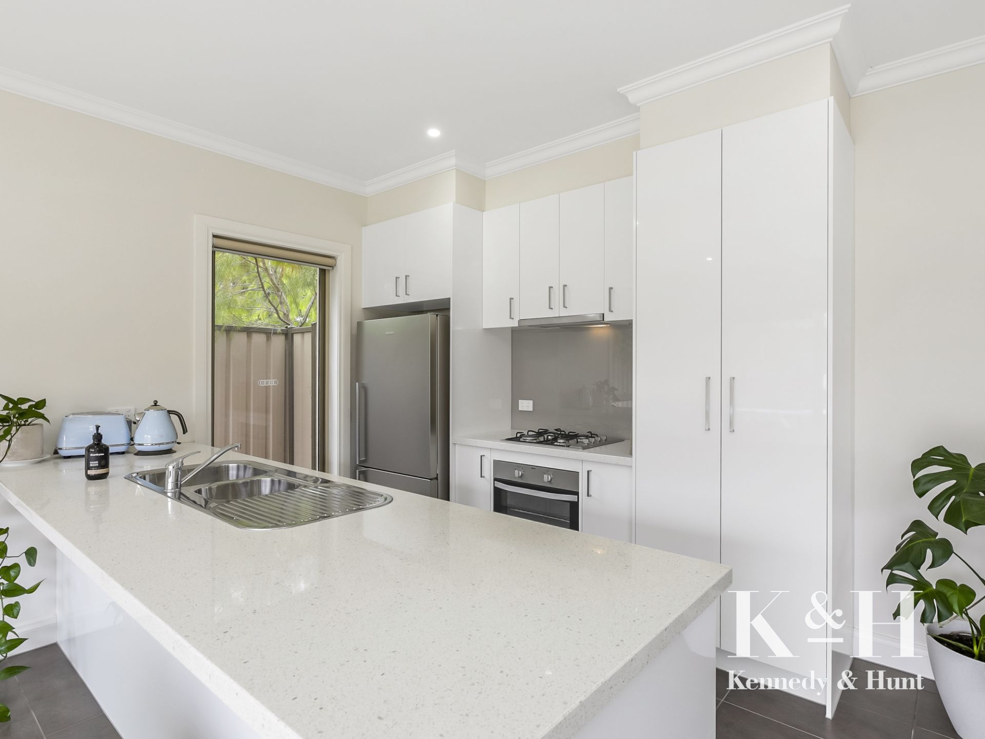 The home's tastefully-appointed interior showcases on two levels; the ground level you will find a large master bedroom with ensuite and WIR showcasing a leafy green outlook, spacious and versatile open-plan living/dining area complimented by a sleek stone bench kitchen complete with splashback, quality appliances and double sliding doors opening out to the courtyard.