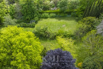 Outbuildings include a woodshed with storage for garden tools, an outdoor loo (handy for garden parties), and garage.
