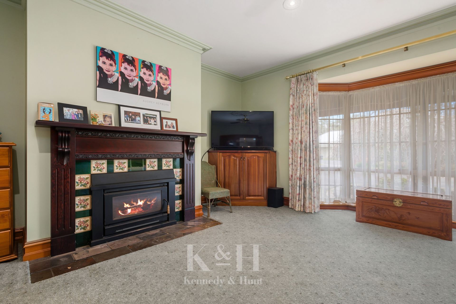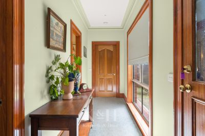 Behind its charming brick and wrought iron fence, the home immediately impresses with timeless street appeal. Mature trees and established gardens create a sense of sanctuary, while inside, classic features - including bay windows, ceiling roses, decorative archway, wall panelling, and a Victorian-style mantlepiece to the lounge- bring character.
