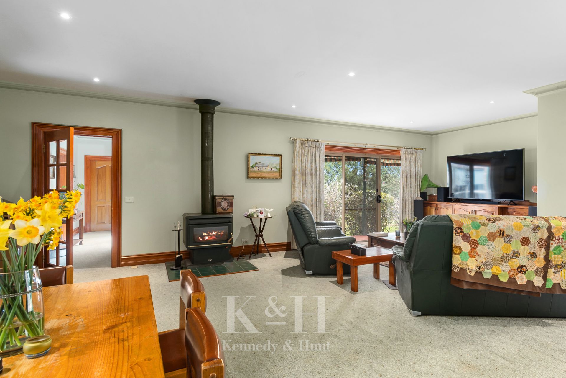 The heart of the home is the expansive kitchen, meals, and family area which enjoys leafy garden views. A wood heater adds warmth and charm, while ducted heating and split-system cooling ensure year-round comfort, and solar adds efficiency. A spacious second living room, complete with its own wood heater, offers flexibility and could easily be adapted as a fourth bedroom if desired.